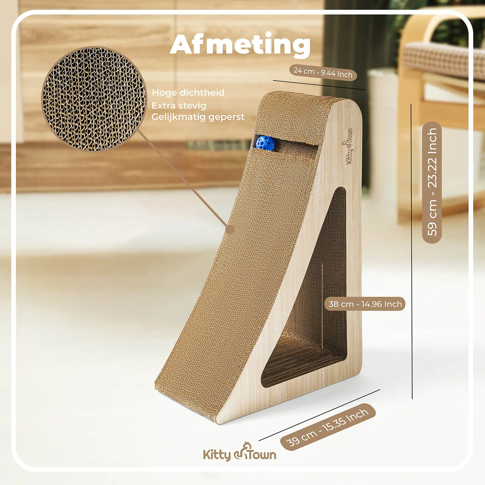 Het ergonomische ontwerp van onze design krabpalen is afgestemd op het natuurlijke gedrag van katten. Dit design krabmeubel biedt krabbare oppervlakken aan zowel de binnen- als buitenkant, waardoor het een veelzijdig meubelstuk is dat naadloos in elk interieur past. De driehoekige vorm zorgt voor een uitdagende klimervaring en biedt een tunnel waarin katten kunnen rennen, spelen of zich kunnen terugtrekken voor een dutje.