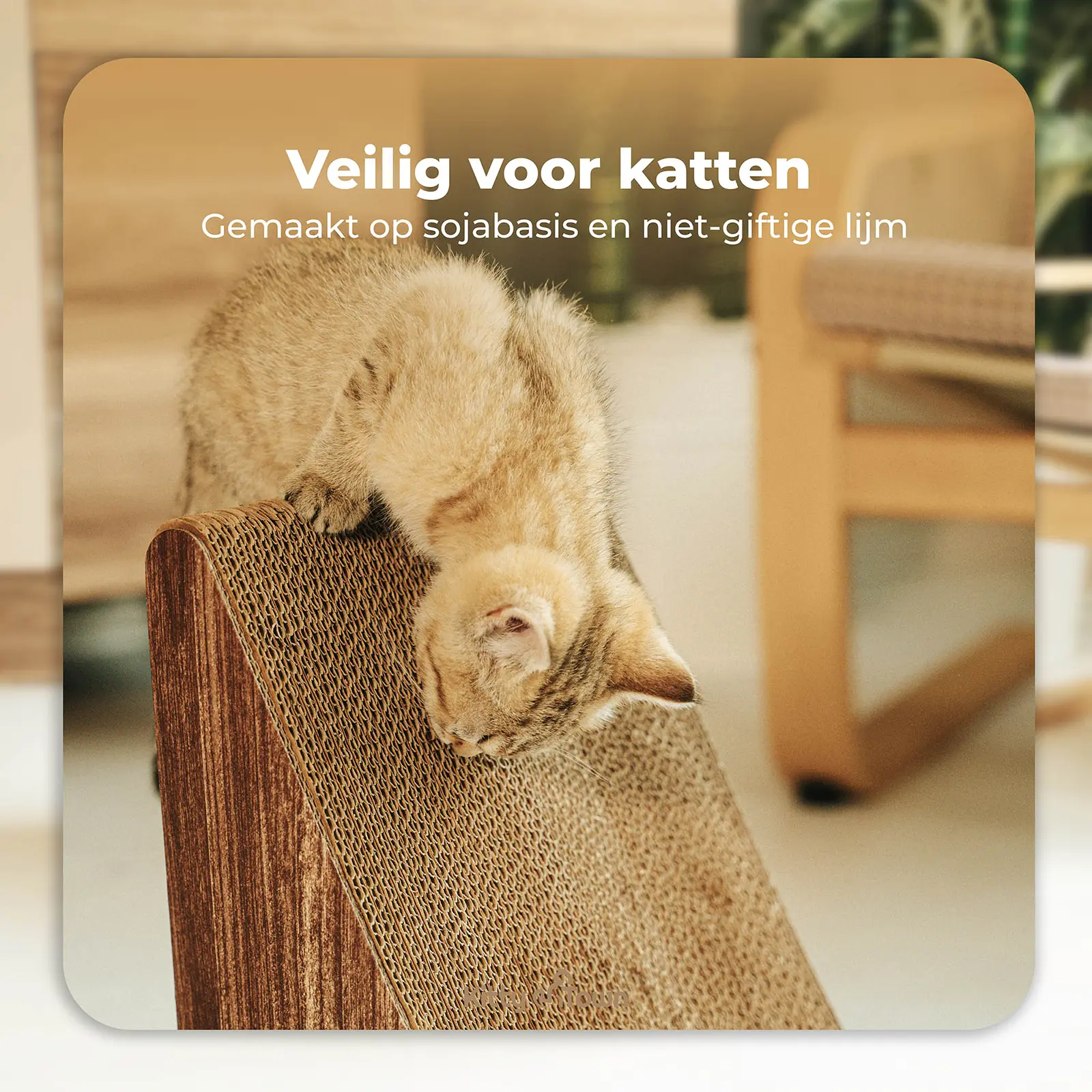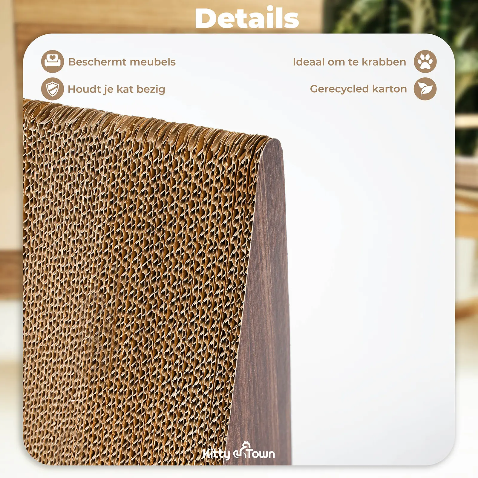 Onze ergonomisch ontworpen katten krabplank is gemaakt van duurzaam geperst krabkarton, speciaal ontwikkeld om uw meubels te beschermen terwijl het de natuurlijke krabbehoeften van uw kat vervult. Dit stijlvolle krabmeubel past moeiteloos in elk modern interieur en biedt een perfecte combinatie van functionaliteit en design.