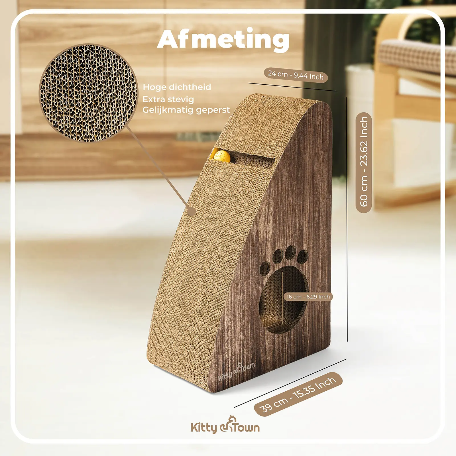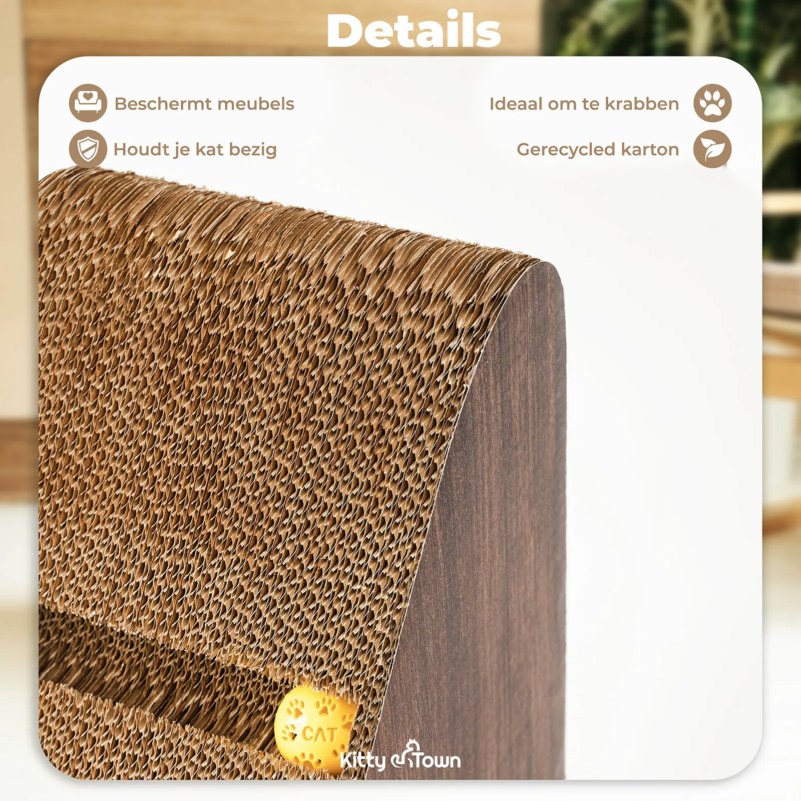 Ontdek bij Kitty Town stijlvol en duurzaam krabkarton! Onze ergonomische krabplank kat beschermt uw meubels en voorziet in de natuurlijke krabbehoeften van uw kat. Dit krabmeubel is ideaal voor elk modern interieur en biedt een perfecte balans tussen functionaliteit en design.